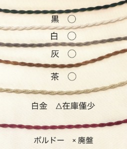 ガラスカラーのみならず、コード色も豊富なセレクションからお選びいただけておりましたが、残念なことに製造元の廃業に伴い、今後のご発注はコード色が以下の4色のみとなりました。